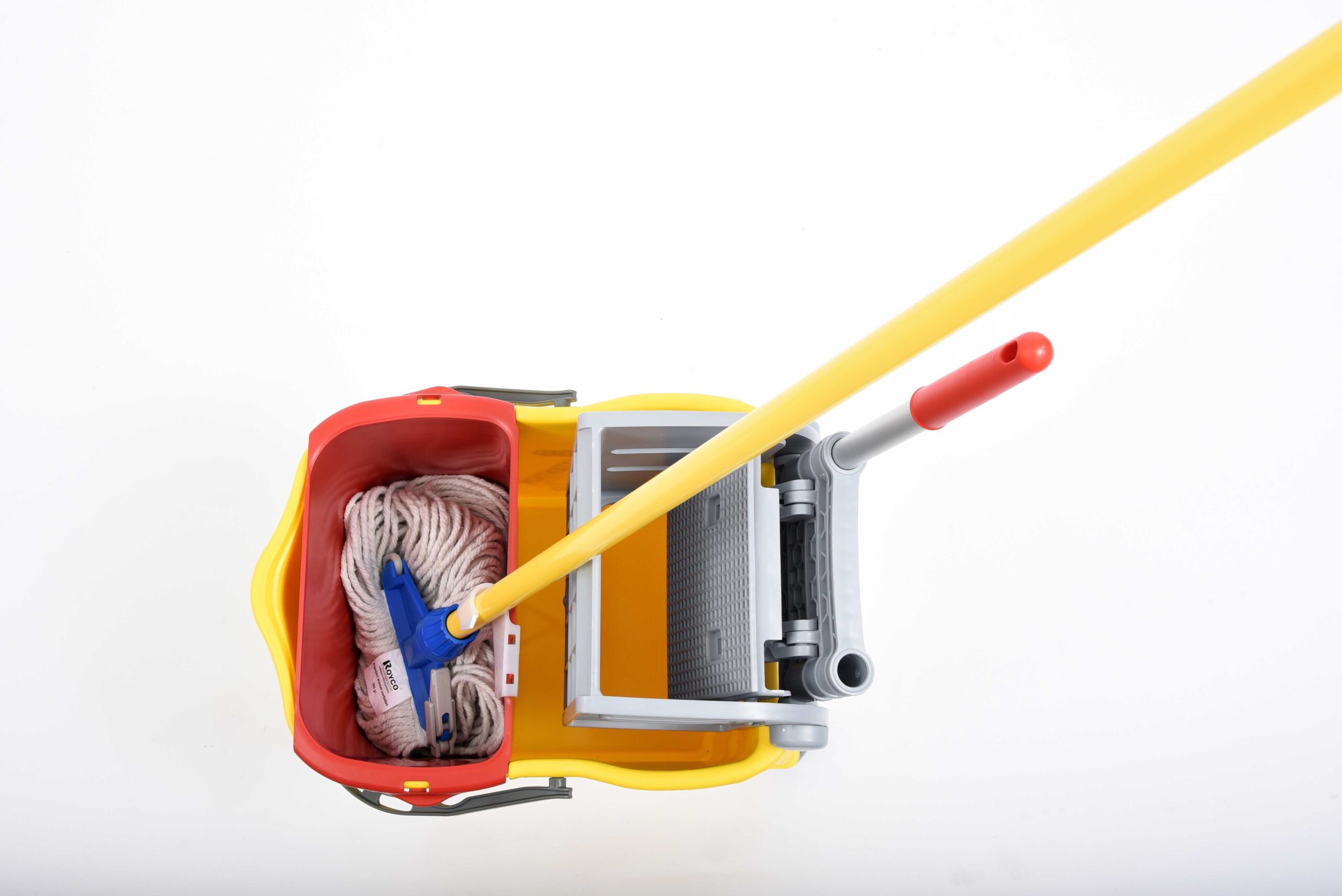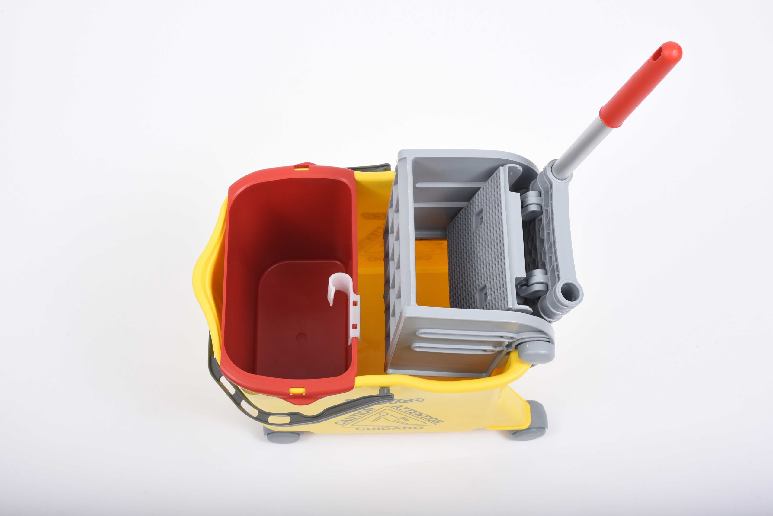 Carro Mini Top con Prensamopas horizontal. Balde de plástico inyectado virgen de 20 litros. Balde interior removible rojo para división de agua. Clip de fijación de cabo para evitar la caída accidental del mismo. Ruedas giratorias de 50 mm diam. que permite su fácil desplazamiento. Su prensa facilita el escurrido de la mopa en forma rápida y con el menor esfuerzo. Uso doméstico o en áreas reducidas.