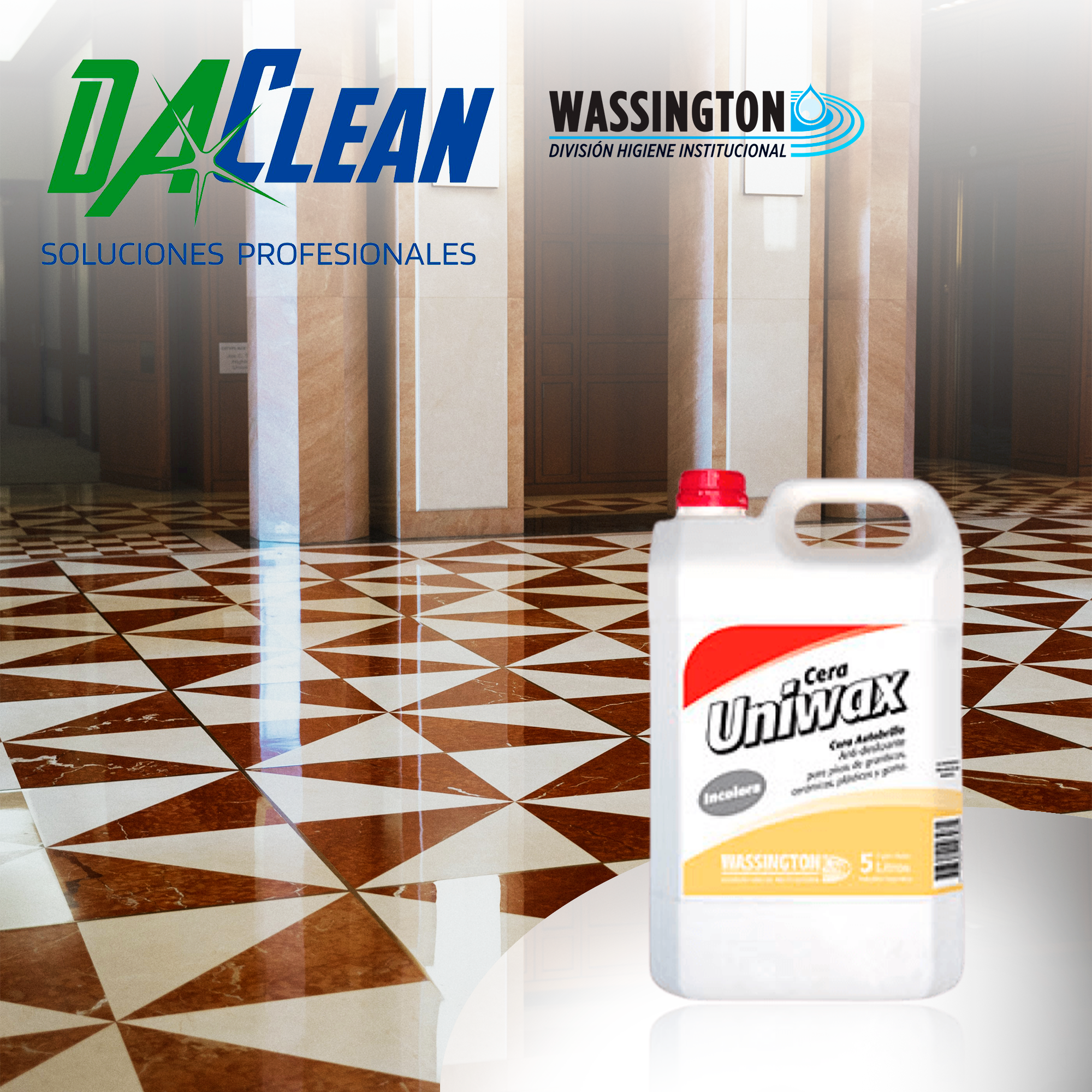 UNIWAX es una cera líquida de base acuosa, autobrillante y relustrable para pisos expuestos al alto transito. Puede aplicarse sobre cualquier supercie lavable como mosaicos, plásticos, cerámicos, vinílicos, graníticos, linóleum, asfálticos, mármoles, goma, etc. Su excelente durabilidad permite relustrados posteriores sin necesidad de nuevas aplicaciones. Sus variantes de color Negro o Rojo harán resurgir a nuevo el color original de sus pisos.